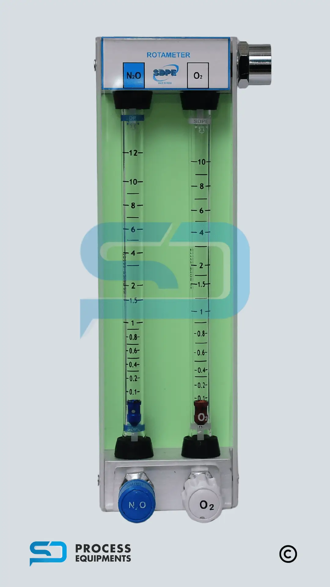 The SDPE Veternity Anesthetic Flow Meter (Rotameter) is a precision-engineered device designed for accurate measurement and control of medical oxygen flow, specifically for veterinary anesthesia applications. It features a durable housing equipped with single or dual oxygen-calibrated glass tubes with a high-visibility float for reliable readings.
