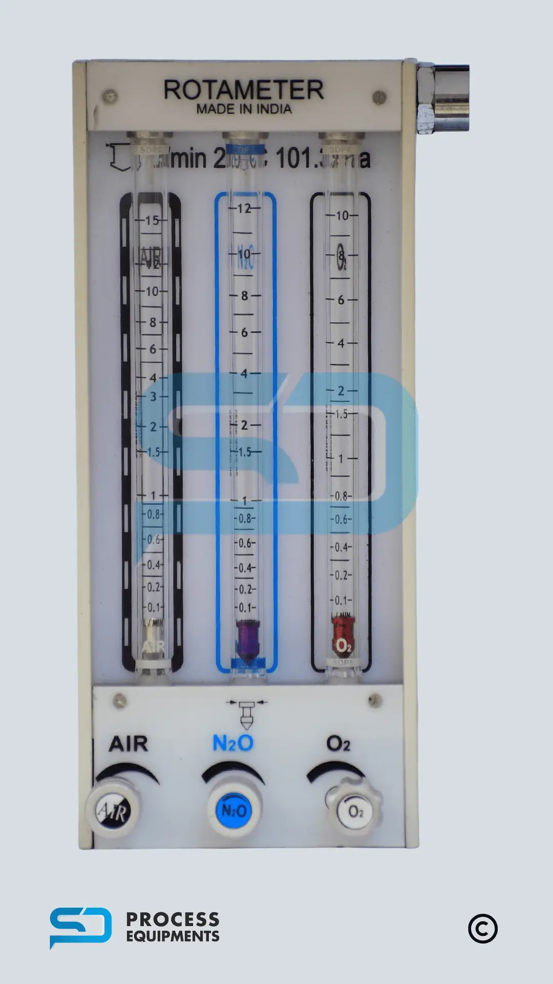 Flow Meter consist of housing and a set of calibration glass tube with bobbin float. Calibration tube can be provided in a combinations of (O2+N2O) or customer requirement.