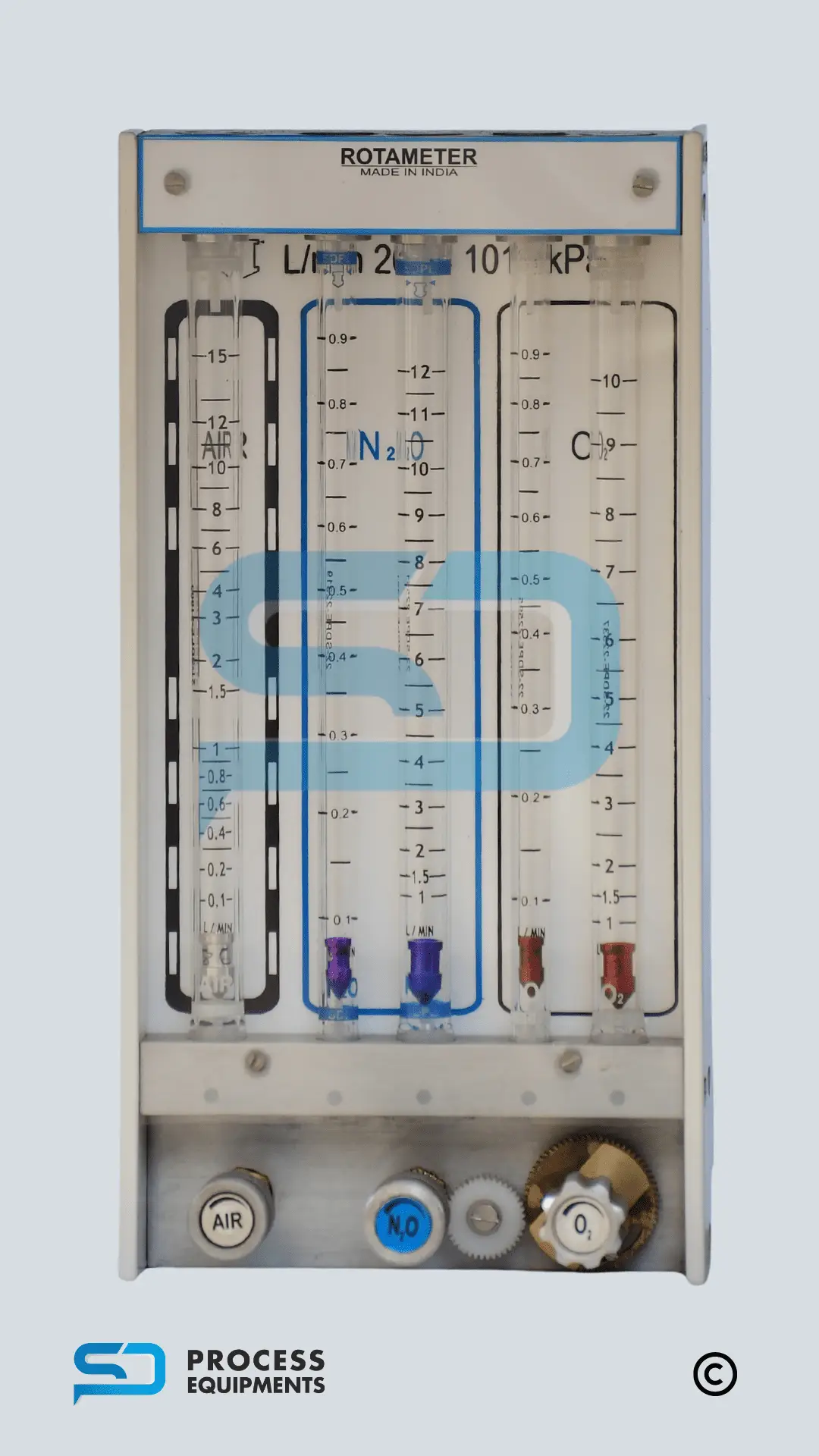 Flow Meter consist of housing and a set of calibration glass tube with bobbin float. Calibration tube can be provided in a combinations of (O2+N2O) or customer requirement.